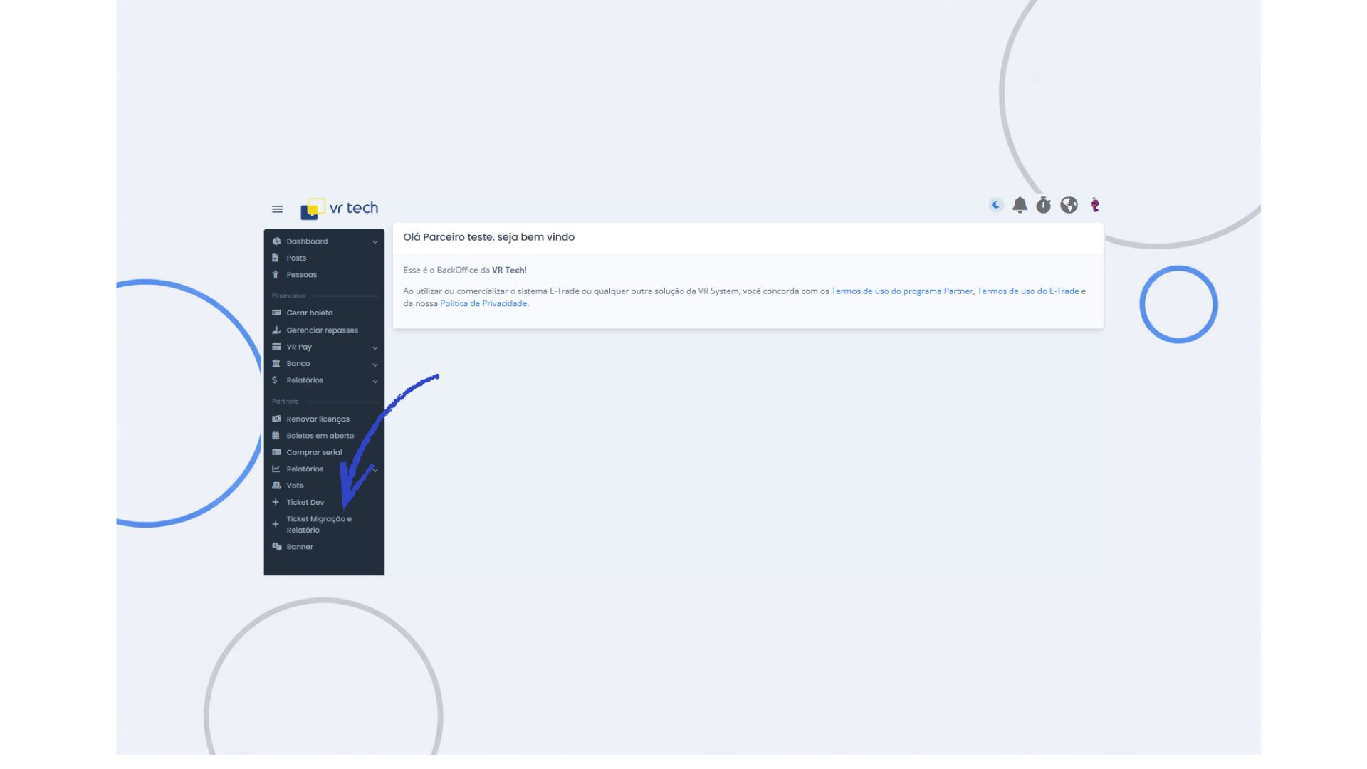 No menu lateral, encontre a parte de Partner e depois clique em Ticket Migração e Relatório.